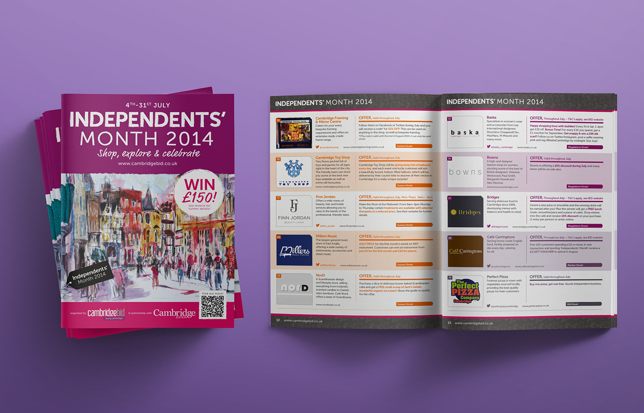This was an A5 booklet where you could see all the different independent retailer listings in the city of Cambridge. I created the look and feel and page layouts.